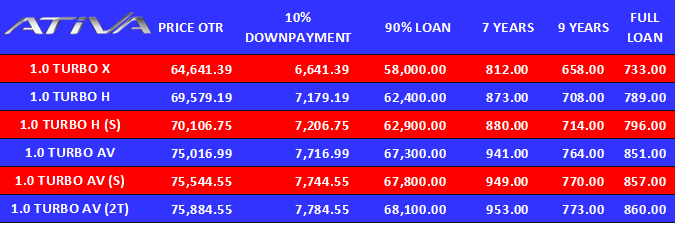 Enjin Ativa ini menghasilkan 98 PS pada 6,000 rpm dan 140 Nm tork dari 2,400 rpm hingga 4,000 rpm. Ini menyaksikan kelebihan 30 PS dan 50 Nm daripada unit enjin sama tanpa turbo. Namun, tork maksimumnya dicapai lebih awal, bahkan lebih awal daripada enjin 1.5L Myvi (136 Nm pada 4,200 rpm). Perodua maklumkan yang enjin 1.0L turbo ini mampu memberikan prestasi sama seperti 1.5L